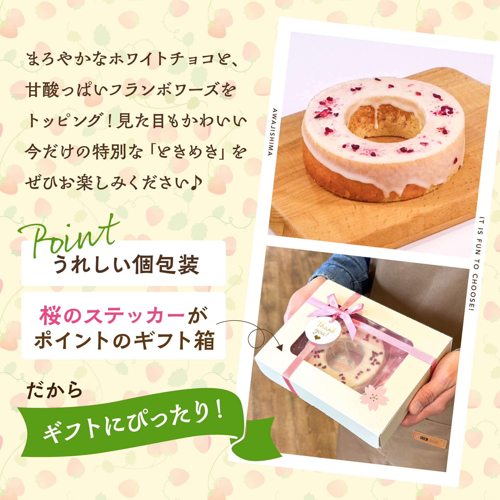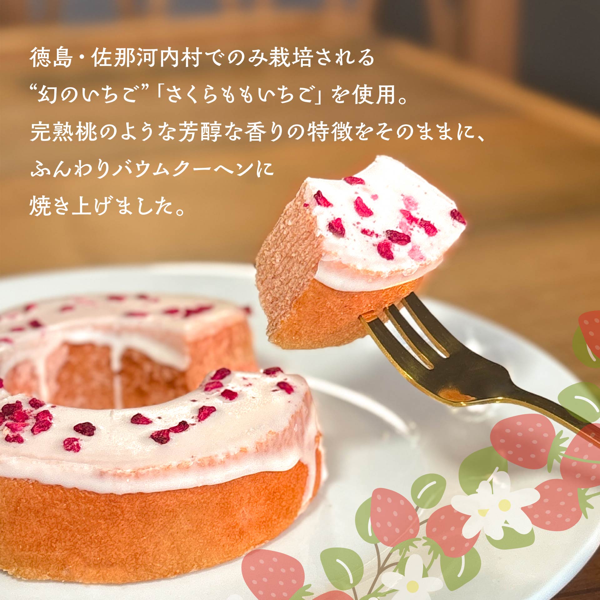 徳島県産さくらももいちごを使用した、いちごの香りがふんわり広がるバウムクーヘンに、
